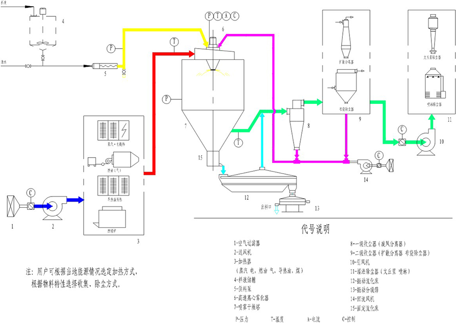 空氣通過(guò)過(guò)濾器和加熱裝置后,進(jìn)入干燥塔頂部的熱風(fēng)分配裝置,通過(guò)此裝置使?jié)崈舻摹岬目諝饩鶆虻倪M(jìn)入干燥塔,并呈螺旋狀轉(zhuǎn)動(dòng),同時(shí)將料液送到安置在干燥塔頂中間的離心霧化器中,料液被離心霧化器霧化成霧滴,使料液和熱空氣的接觸面積增加,水分迅速蒸發(fā),在短時(shí)間內(nèi)干燥。再通過(guò)之后的除塵設(shè)備等,將干燥好的成品取出。成品連續(xù)的由收料口輸出,廢氣由引風(fēng)機(jī)排空。